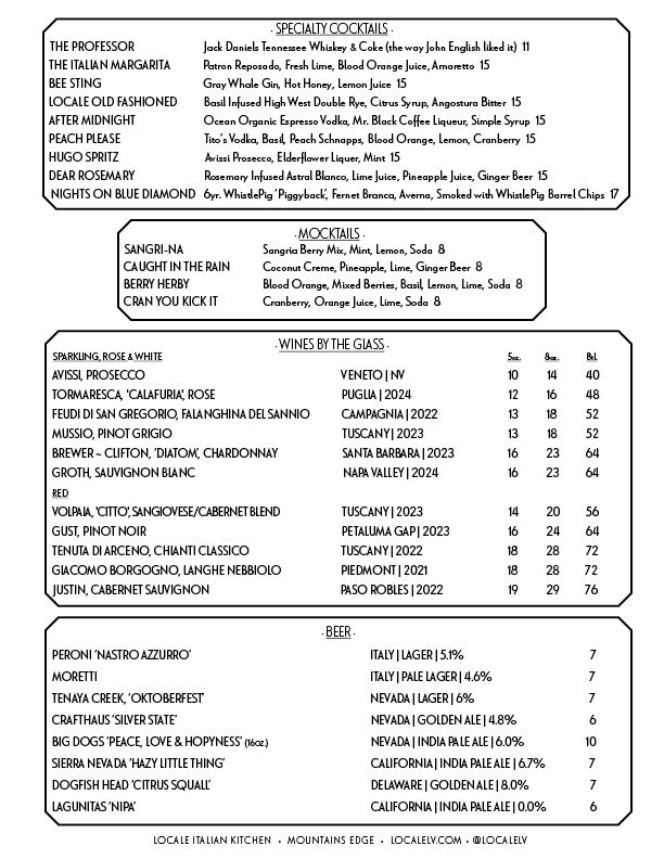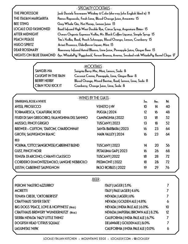 Indulge in the flavors of Italy with our exquisite housemade dishes, crafted cocktails, and vast wine selection served right here in the lively heartland of Las Vegas.